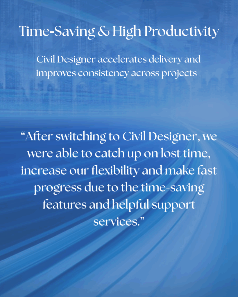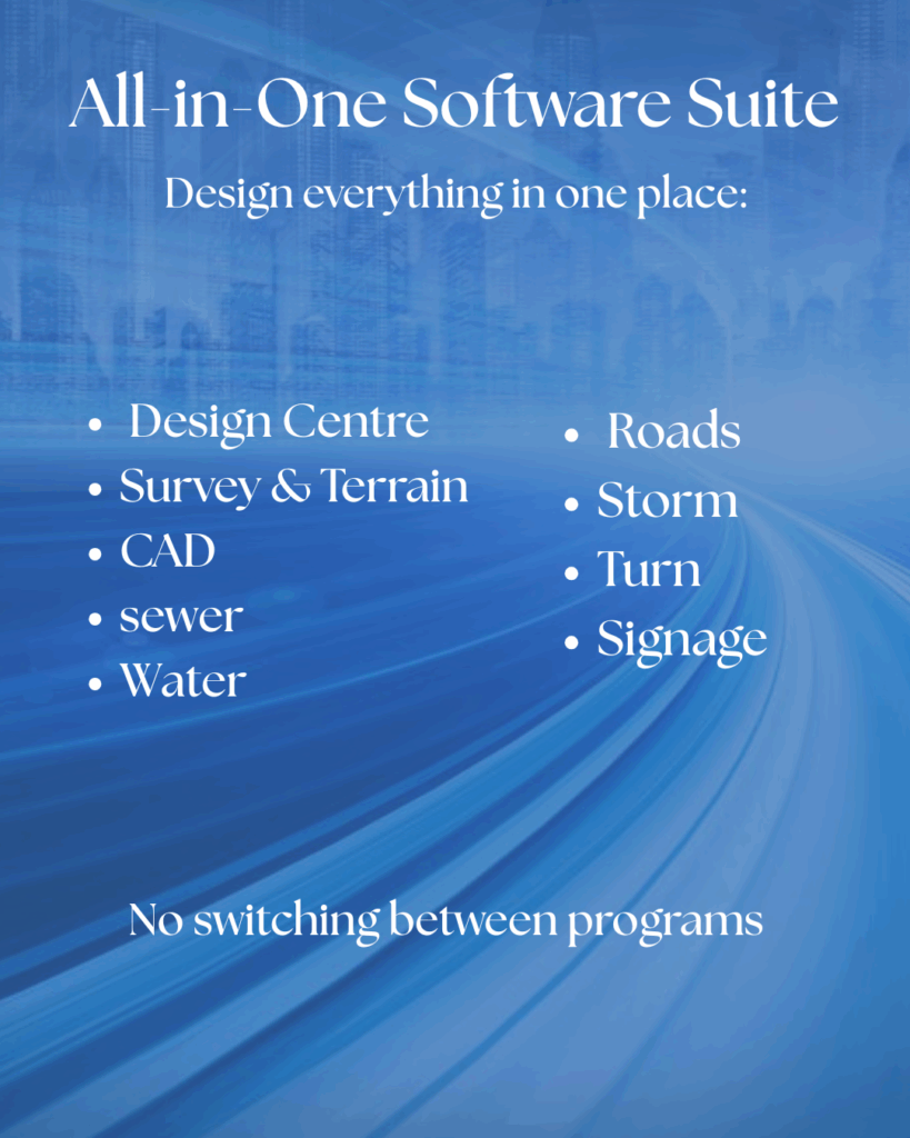 For more than three decades, Civil Designer has been the go-to all-in-one design solution for infrastructure projects worldwide. From roads, stormwater, and sewer networks to water systems, signage, CAD, survey, and terrain, it streamlines every stage of the design process — with no need to switch between programs.